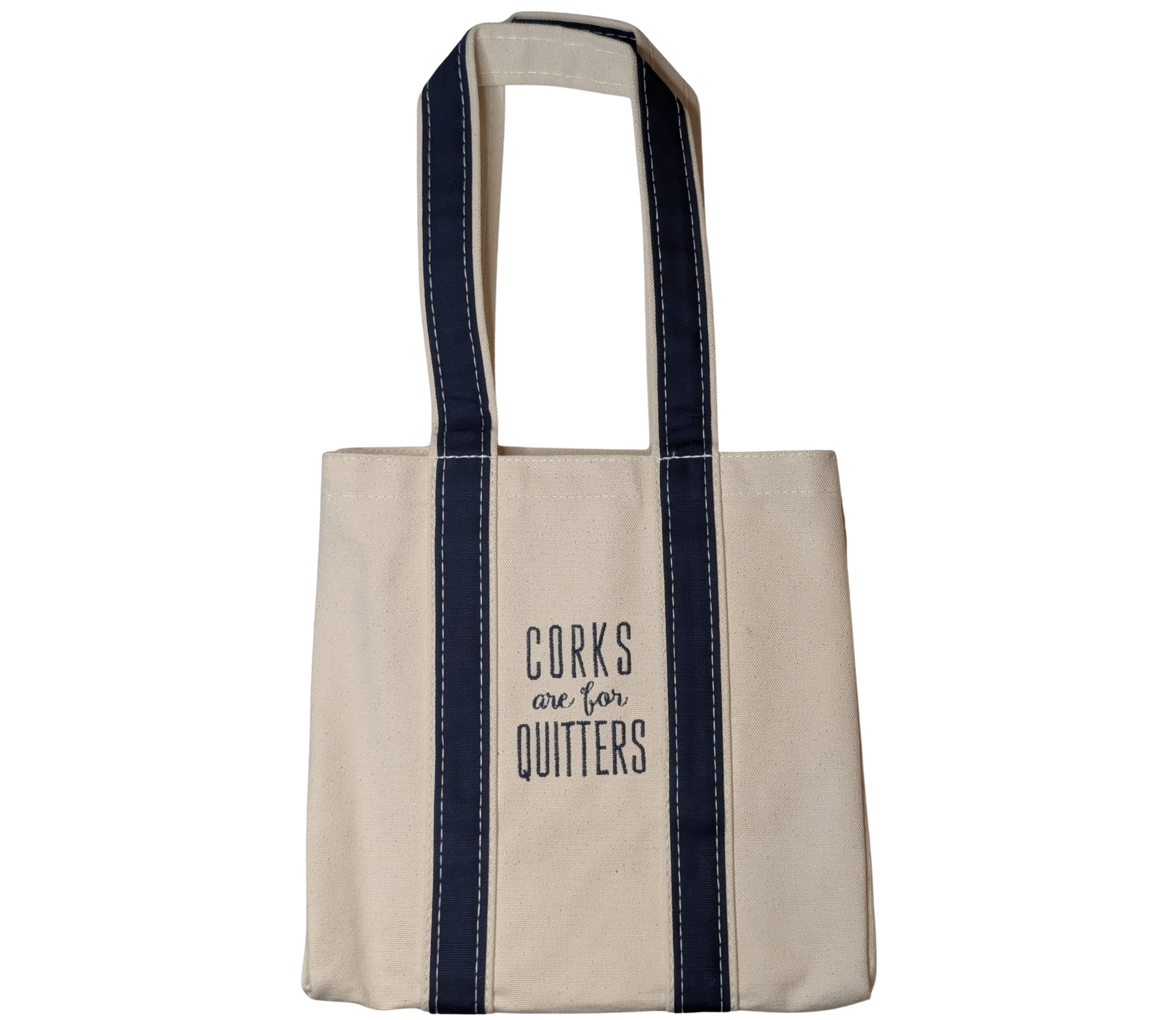 Uncork and unwind—because who really stops at one? This natural canvas tote with navy trim is embroidered with the cheeky phrase “Corks are for Quitters”, making it a perfect companion for wine nights, parties, and gifting. With interior partitions, it keeps up to four bottles safe and organized while adding a splash of humor.