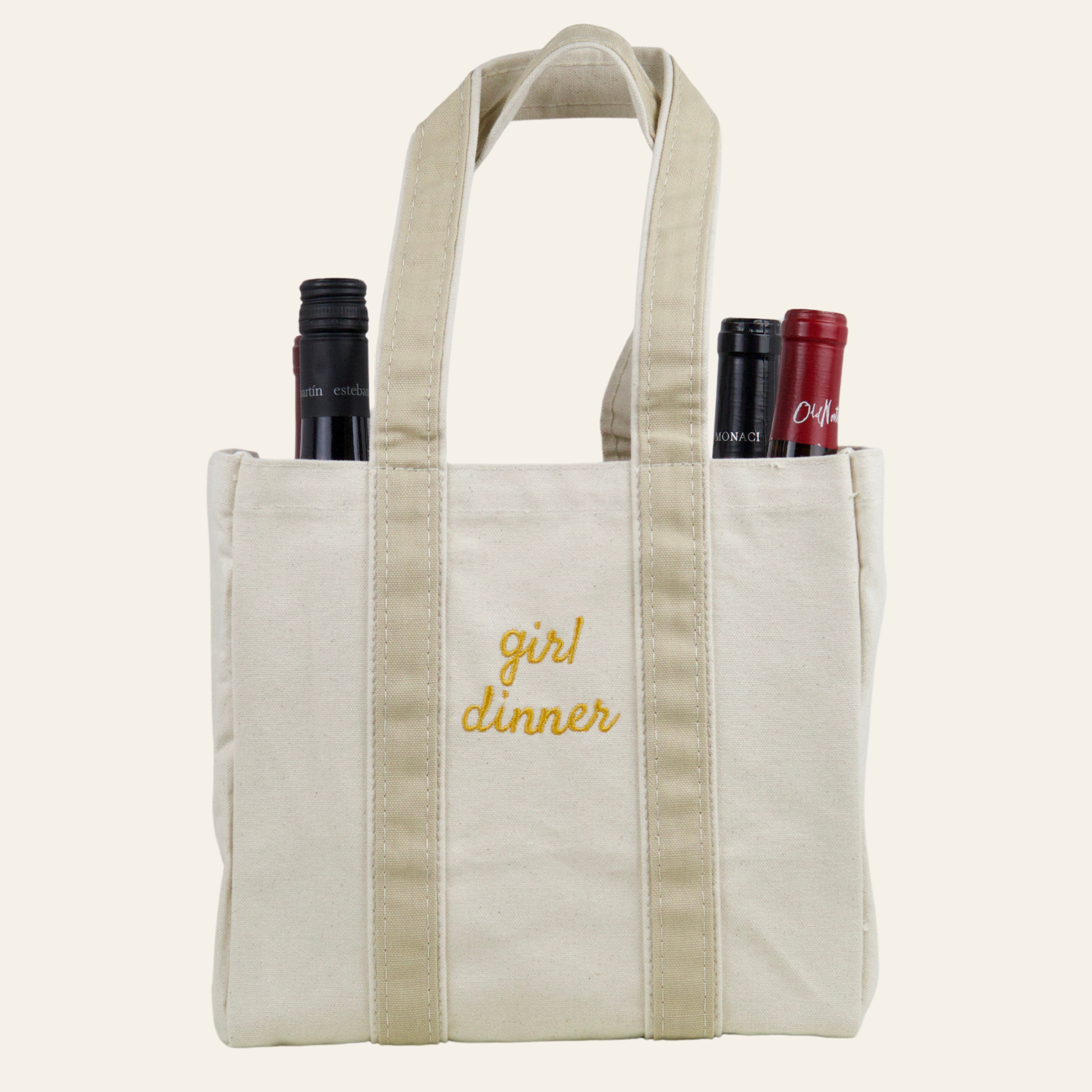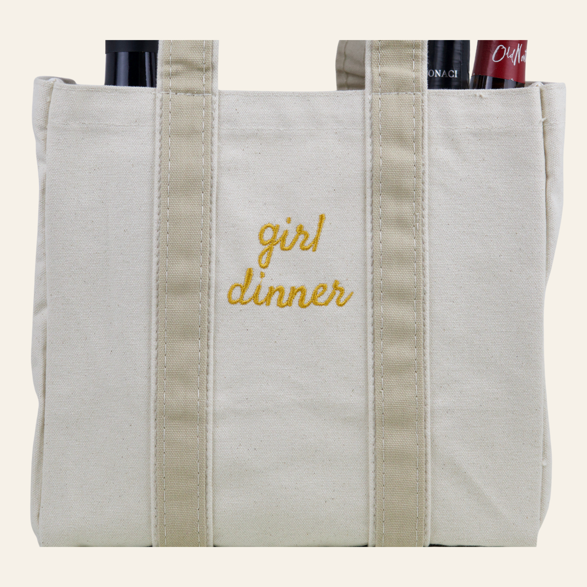 Because sometimes girl dinner means a bottle (or four). This sturdy canvas tote is built with adjustable partitions to hold up to four bottles safely in place, making it your go-to for wine nights, book clubs, and picnics. Equal parts practical and tongue-in-cheek, it’s a tote that carries your essentials with style and a wink.