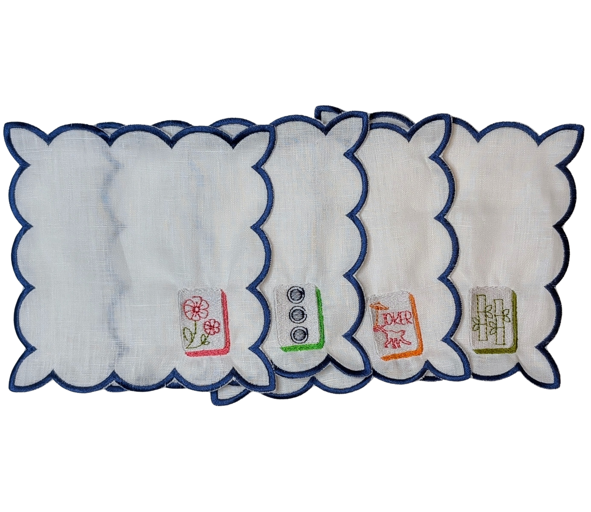 Bring a touch of playful elegance to game night. These crisp white linen cocktail napkins feature a scalloped navy trim and embroidered mahjong tiles, each with a unique design—perfect for mixing style with a love of the game.