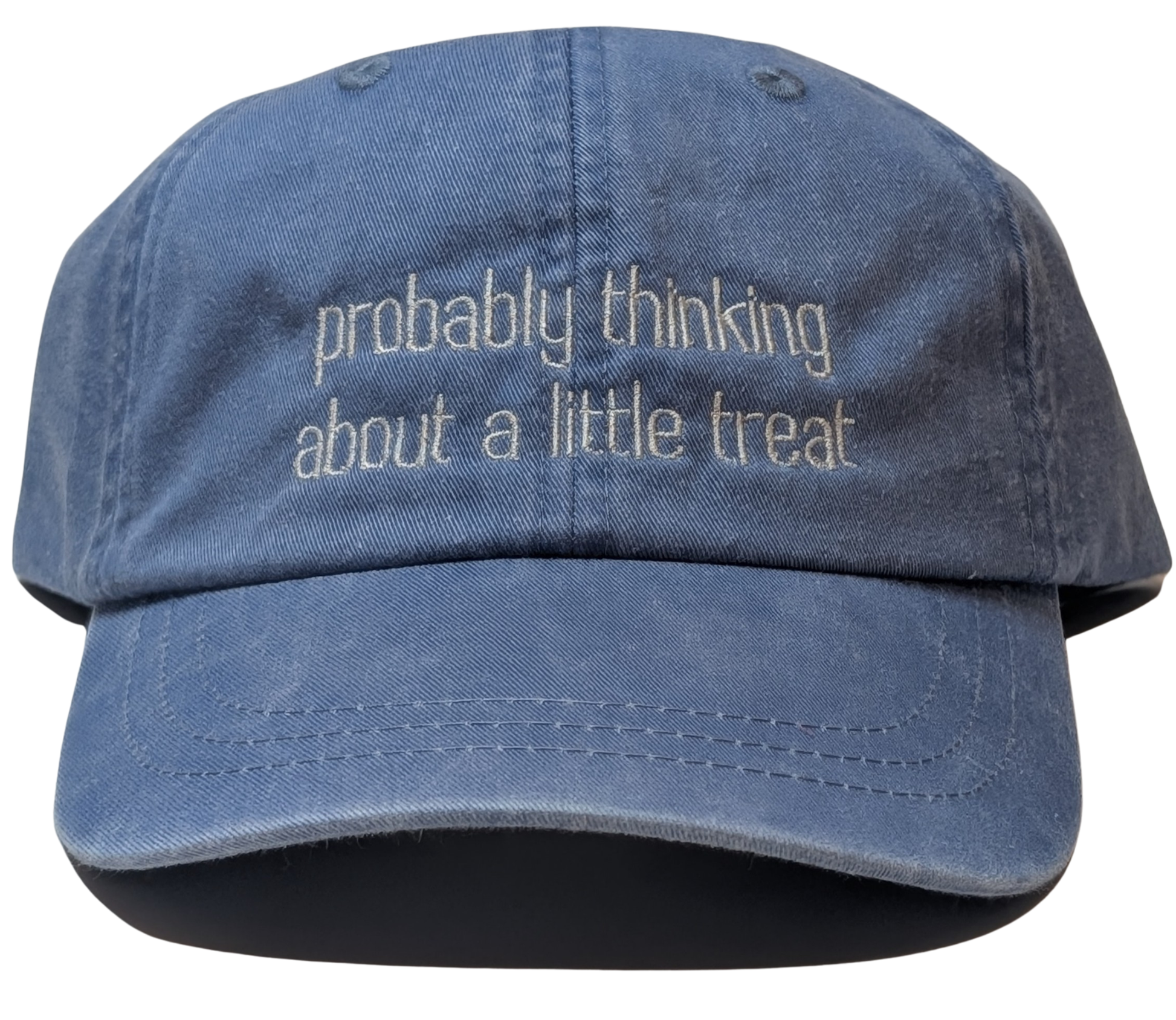 A playful cap for anyone who always has snacks on the brain. This relaxed, vintage-washed blue baseball cap is embroidered with the witty phrase “probably thinking about a little treat” in light thread for a subtle but cheeky statement.