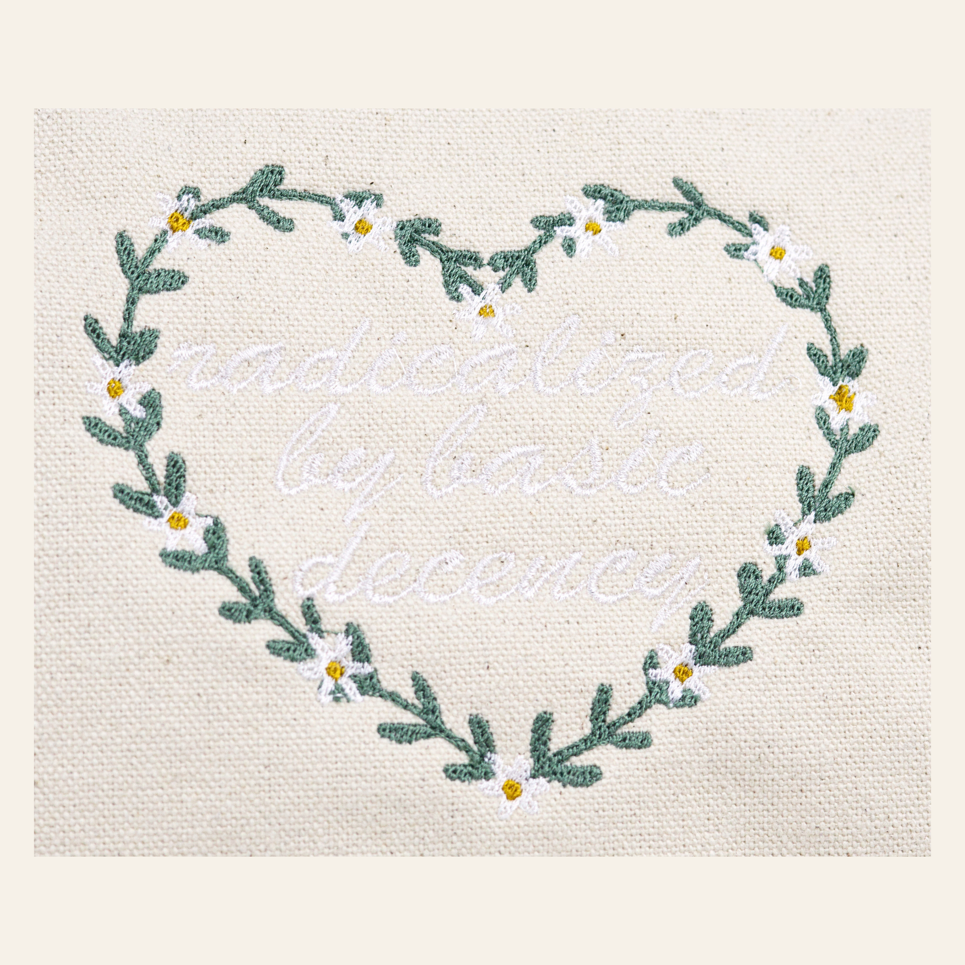 This canvas pouch pairs gentle design with a powerful sentiment. Embroidered in crisp white thread, the phrase “radicalized by basic human decency” sits at the center of a stitched floral heart — a quiet reminder that empathy and compassion still matter.