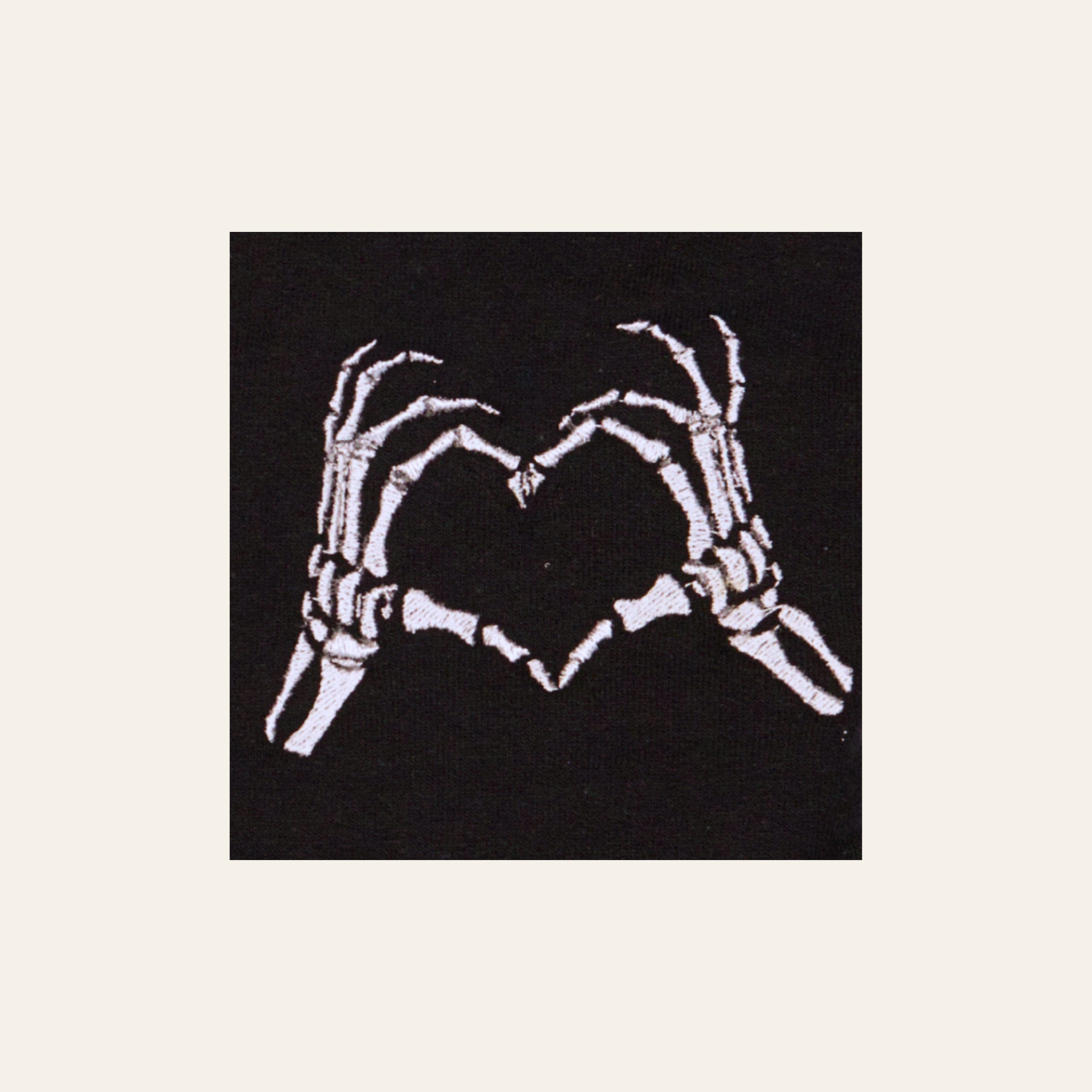 This classic black sweatshirt features delicate embroidered skeleton hands forming a heart — a quiet nod to love with a slightly eerie twist. It’s understated, clever, and just unexpected enough to stand out without trying too hard.